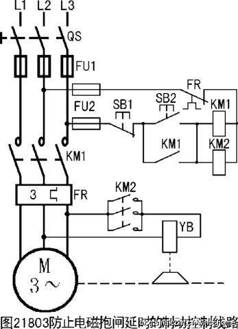 解决上述问题的简单方法是;在线圈YB的供电回路中串入接触器KM的常开触头。如果辅助常开触头容量不够时,可选用具有五个主触头的接触器。或另外增加一个接触器,将后增加接触器的线圈与原接触器线圈并联。将其主触头串入YB的线圈回路中。这样可使电磁抱闸YB的线圈与电动机主回路同时断电,消除了YB的延时释放。